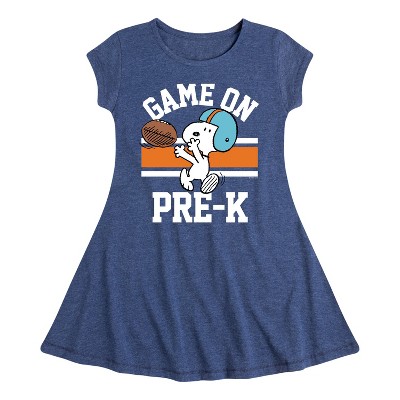 Peanuts - Game On Pre-K - Back to School - Toddler and Youth Girls A-line Dress - From the best-loved comic strip in history comes officially licensed PEANUTS apparel for fans everywhere. Show your love for Charlie Brown, Snoopy, Woodstock, Lucy, Linus, Pigpen and the whole gang. Copyright Peanuts.