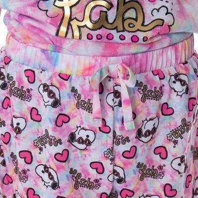 top-notch PRINTED DESIGNS - This Peanuts pajama set for girls features a tie-dye pattern short sleeve top and shorts. The shirt features a cute character design of Snoopy wearing heart sunglasses and a script design that reads, So Fab!! The pajama shorts feature a matching allover character pattern and elastic-stretch waistband!