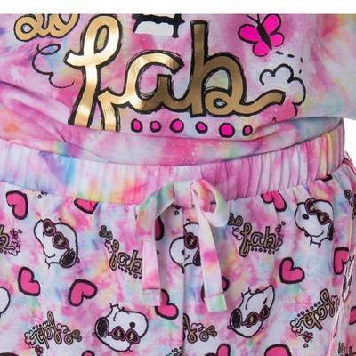 top-notch PRINTED DESIGNS - This Peanuts pajama set for girls features a tie-dye pattern short sleeve top and shorts. The shirt features a cute character design of Snoopy wearing heart sunglasses and a script design that reads, So Fab!! The pajama shorts feature a matching allover character pattern and elastic-stretch waistband!