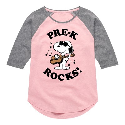 Peanuts - Pre-K Rocks - Toddler And Youth Girls Raglan Graphic T-Shirt - From the best-loved comic strip in history comes officially licensed PEANUTS apparel for fans everywhere. Show your love for Charlie Brown, Snoopy, Woodstock, Lucy, Linus, Pigpen and the whole gang. Copyright Peanuts.