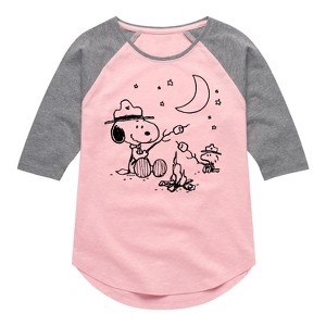 Peanuts - Snoopy Camping - Toddler And Youth Girls Raglan Graphic T-Shirt - From the best-loved comic strip in history comes officially licensed PEANUTS apparel for fans everywhere. Show your love for Charlie Brown, Snoopy, Woodstock, Lucy, Linus, Pigpen and the whole gang. Copyright Peanuts.