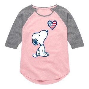 Peanuts - Snoopy Flag Heart - Toddler & Youth Girls Raglan Graphic T-Shirt - From the best-loved comic strip in history comes officially licensed PEANUTS apparel for fans everywhere. Show your love for Charlie Brown, Snoopy, Woodstock, Lucy, Linus, Pigpen and the whole gang. Copyright Peanuts.