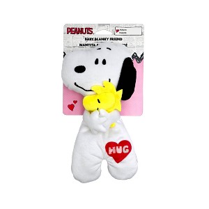Peanuts Valentine Snoopy blanky friend has the sweetest little smile that makes everyone happy. This Snoopy blanky is 10-inches tall, and was created using the softest of materials. Snoopy is holding his best friend Woodstock, giving him the biggest hug you can imagine! Snoopy Blanky friend features satin inner ear, crinkle, and printed “Hug” message in a heart. Keep baby entertained with this adorable Snoopy blanky, who is a soothing friend for playtime in the car seat, stroller, and even naptime.