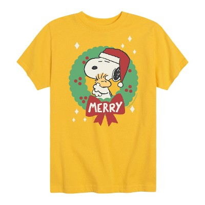 Boys' Peanuts Snoopy & Woodstock Chasing Snowflakes Christmas Short Sleeve Graphic T-Shirt - Yellow - Small
