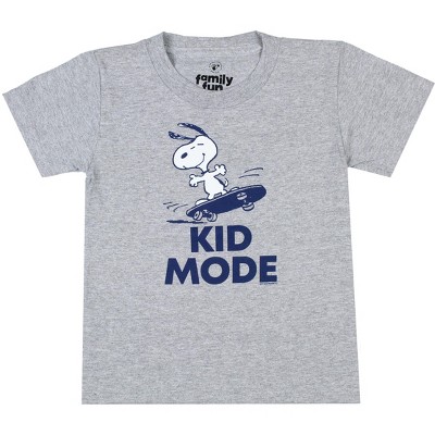 • This heather grey tee features a front graphic print of snoopy riding his skateboard and the text that reads "Kid Mode".