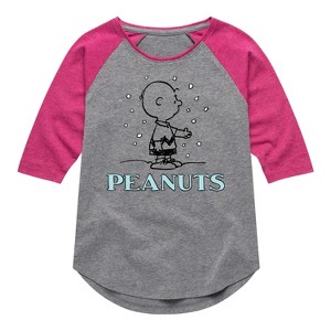Peanuts - Charlie Snow - Toddler & Youth Girls Raglan Graphic T-Shirt - From the best-loved comic strip in history comes officially licensed PEANUTS apparel for fans everywhere. Show your love for Charlie Brown, Snoopy, Woodstock, Lucy, Linus, Pigpen and the whole gang. Copyright Peanuts.