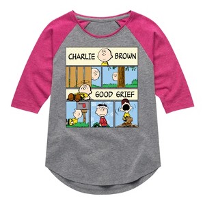 Peanuts - Good Grief Comic - Toddler & Youth Girls Raglan Graphic T-Shirt - From the best-loved comic strip in history comes officially licensed PEANUTS apparel for fans everywhere. Show your love for Charlie Brown, Snoopy, Woodstock, Lucy, Linus, Pigpen and the whole gang. Copyright Peanuts.