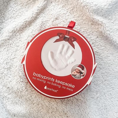Forever cherish your little ones prints during the most wonderful time of the year with Pearhead’s babyprints ornament. This adorable, do-it-yourself, ornament is easy to make and 100% baby safe. The babyprints ornament comes with a package of clay, shaping ring, rolling pin, a red satin ribbon, and a pin to create the ornament hanging hole. Best of all, the clay requires no mixing or baking! Simply knead the clay and roll it out on a piece of foil (not included). Press baby’s hand or foot in the clay gently but hard enough to create an impression. If you make a mistake - no problem! You can redo it as many times as you need until you get the perfect impression. Once finished making the print, use the shaping ring to create a circle around your baby’s print and remove the excess clay. Then use the pin to create a hole in your ornament for the ribbon to go once dry. Let dry for 1-2 days. Once the clay is completely dry, tie the ribbon through the ornament. Now you can hang your adorable babyprints ornament on your Christmas tree or around your home for the holiday season. Babyprints keepsake makes a special and thoughtful gift for baby’s first Hanukkah, Christmas, or Holiday Season. Pearhead’s adorable babyprints ornament is the perfect decoration for your tree and the perfect keepsake to always cherish your little one’s piggies. Finished Ornament: 5" W x 5" H x .75" D, the ornament comes in a cute gift box for easy gifting!
