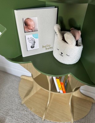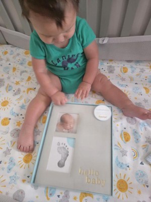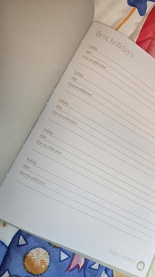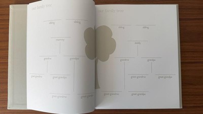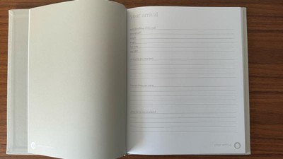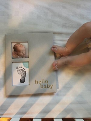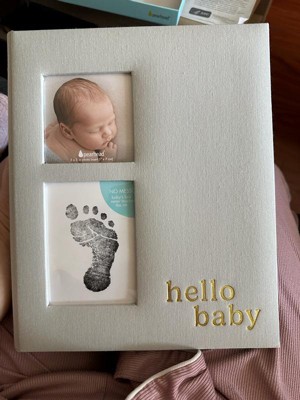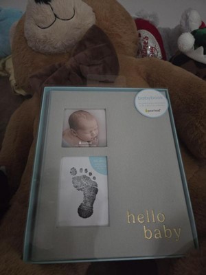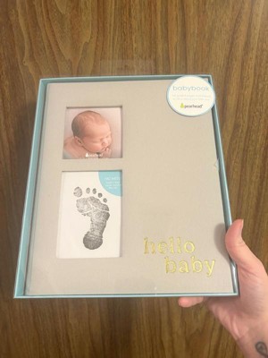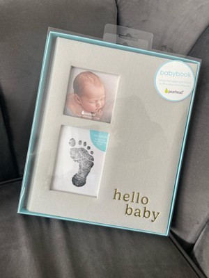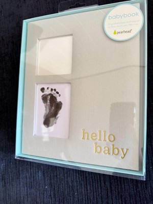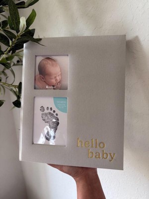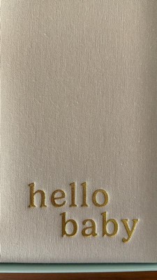 - Ivory linen hardcover baby memory book with gold foil “hello baby” script for timeless charm