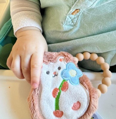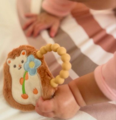 [This review was collected as part of a promotion.] This little teether has quickly become a favorite for my five month old son. It is fuzzy and soft where the hedgehog is and the entire soft part crinkles. It also features a silicone piece that is nice for baby to grab onto and chew on. It's easy to pack up and bring anywhere because the size is small, but it's just the right size for baby! Easily fits in my purse, sweatshirt pocket, or bag and baby can use this as a distraction when he gets antsy basically anywhere in public.