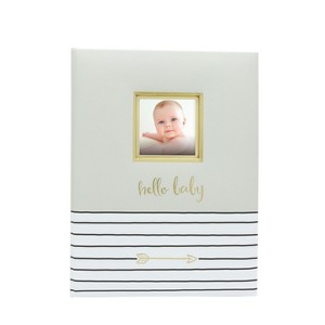 - "hello baby" and trendy arrow design stamped in gold foil on front of baby book