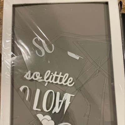 - White, wooden frame includes “so little so loved” printed on the glass front of the frame