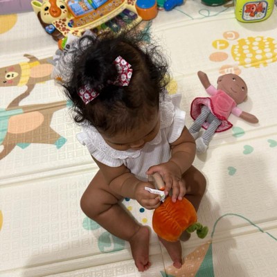 [This review was collected as part of a promotion.] This is perfect for “first Halloween” gift. My little girl really enjoy the sound of the rattle, she sake it like playing an instrument. The pumpkin is soft, will not leave color behind when gets wet. The wooden ring is just perfect side for baby hand.
