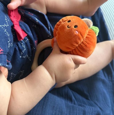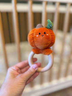 - Pumpkin plush teething toy with festive fall colors and a friendly embroidered face