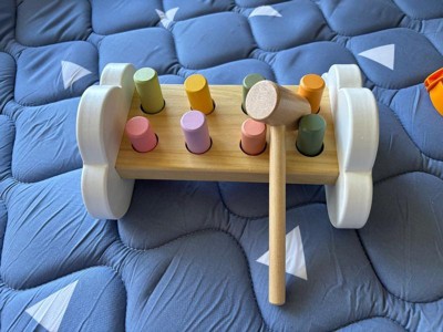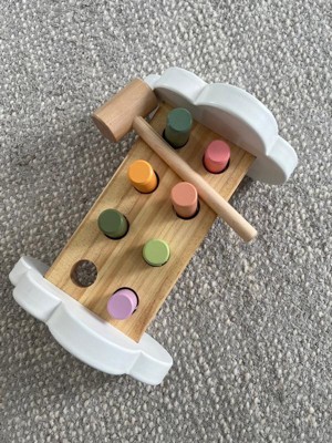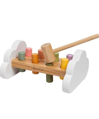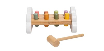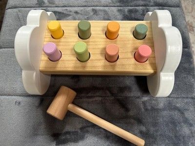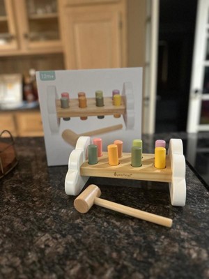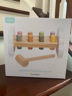 Pearhead's Wooden Hammer Bench Toy is ingeniously designed to spark curiosity in young minds, encouraging learning and faster development during playtime. Crafted for baby boys and baby girls 12 months and up, this sensory toy features round and smooth edges for a secure playtime experience. Parent can let them explore, learn, and play without worry. The 1-year-old toy set includes 8 vibrant pegs that you can pound in on one side and out the other, providing endless opportunities for exploration and fine motor skill development. Watch as your child discovers the joy of arranging and rearranging the colorful pegs. Equipped with a wooden mallet designed for little hands to grasp, the hammer bench encourages hand-eye coordination and imaginative play. Each tap becomes a delightful step in the developmental journey of your little one. Made with FSC-certified materials for ensured durability and timeless function, this educational toy will remain a cherished companion throughout your child's developmental journey. Pearhead wooden baby toys are the perfect gift idea for a baby shower or baby registry list.