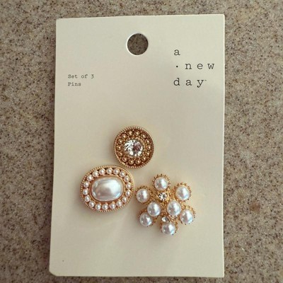 Add an elegant touch to your going-out ensembles with this 3-Piece Brooch Pin Set from A New Day™. This set includes three brooch pins — one round pin with a shiny stone in the center, one oval pin with a white faux pearl in the center surrounded by tiny pearls, and one featuring a cluster of white pearls — to add glam personality to any outfit. Made from nickel-free metal to suit most skin types, these brooch pins boast postback closures for a stay-put fit.