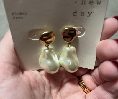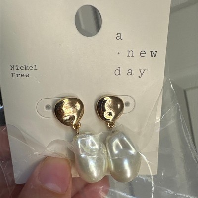 A: The earrings are made from glass, with a faux-pearl drop and gold-tone charm.
