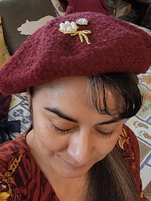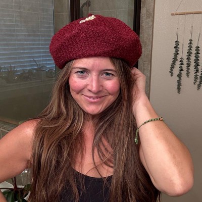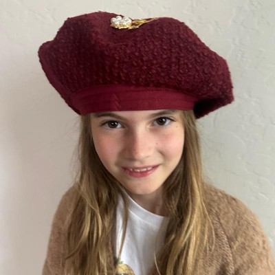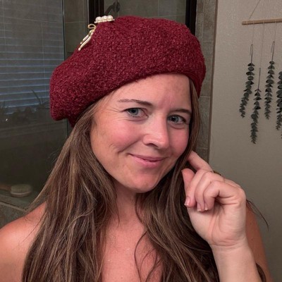 Cranberry beret with added embellishments is perfect for the holidays.