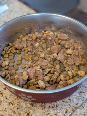 [This review was collected as part of a promotion.] Our boys absolutely love this food! They know they get some every evening so they leave their food in the bowl until we mix some in for their dinner. The gravy in it is perfect so it coats the normal hard food well. The chunks in it are big and thick and it has veggies in it as well. It doesn’t smell too bad either. Some dog foods have a strange smell but this one doesn’t. I think it’s very affordable especially compared to some others we’ve bought and will be purchasing in the future.