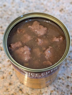 [This review was collected as part of a promotion.] My dog absolutely loved the food ! It had big chunks but i was able to cut some the pieces smaller. Recommend for any dog. I did mix food with dry kibble which my dog loved ! Smelled like good dog food. Cost is affordable. Cans packaged well.