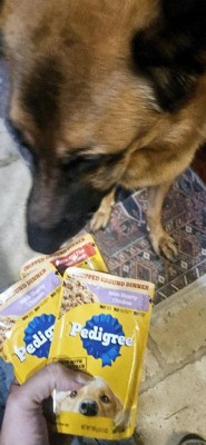 [This review was collected as part of a promotion.] My son’s dog loved these little pouches of Pedigree Ground Dinners. He ate them as a treat (he’s a big dog) or on top of his hard food. They looked like a ground up wet dog food. Typical wet dog food but he seemed to like it better than other wet food. Definitely moist and not dry, which is a plus, but it also wasn’t too runny. I think these are great!