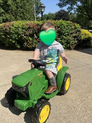 John Deere Mini Tractor provides endless excitement and is the perfect ride-on vehicle for little kids looking for heavy-duty adventure. They will enjoy their ride with working lights and sound to play with along the way. Easy to stop and go with the accelerator pedal at their feet. This preschool ride on vehicle drives at the speed of 1.5 mph. They’ll ride around outdoors or indoors (rides great on carpet!) and their days will be filled with fun and laughter. The John Deere Mini Tractor includes a 6-volt rechargeable battery and recharger. Made in the USA, in our Fort Wayne, Indiana factory using domestic and global components.