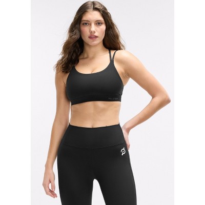 One shoulder bra with o-ring detail at shoulder, multi-sized elastic straps, and interior cup pockets. Peloton Cadent Fabric is a performance double knit—breathable, moisture wicking and designed for ease of motion while offering moderate compression. Durable enough for all activities.