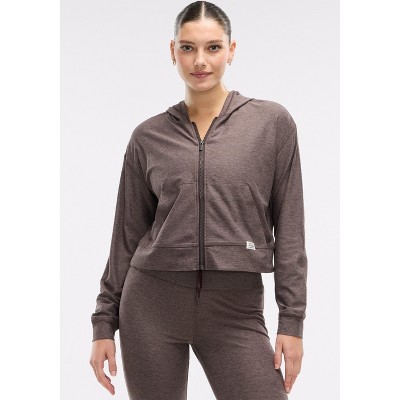 Full zip, boxy sweatshirt with meet and greet length, side pockets, and self fabric cuffs and bottom hem