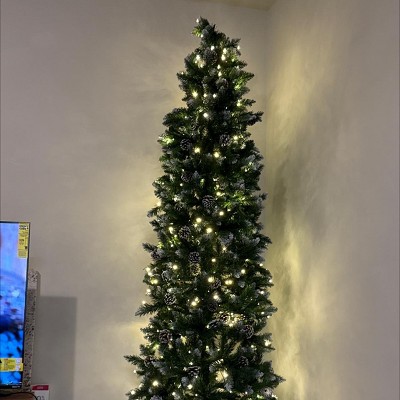 This is a beautiful 7.5 ft skinny Christmas tree. It is so full and has white tipped branches and white tipped pine cones all over. It looks so pretty and doesn’t have to gave any decorations with all if the pine cones. It is only white colored lights for your info