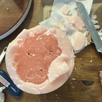The wics were just barely sticking out of the wax, that they would barely light and didn’t stay lit for more than a minute bec the melted wax kept putting the flames out. I had to cut some wax off the top only to find a different wax on the inside. It’s a different color/opacity and has barely any smell besides an unpleasant waxy smell. Maybe it’s to help it glow, but it should be just as scented. Didn’t realize I was buying a massive $18 candle that’s only coated in scented wax and not filled with it. Very annoyed.