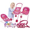 - 19 PIECE SET: Includes a doll stroller, highchair, bouncer, and a diaper bag / handbag plus accessories