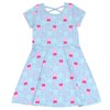 • All over print design; Rib knit crew neck collar; Soft hand screen print artwork; Fashionable skater style dress; Cross back design; Pull on closure