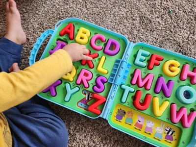 [This review was collected as part of a promotion.] Our daughter who is two but barely shy of three years old loves Peppa Pig and is excited to play with her new toy. She likes calling out the letters as she lifts them and see’s what under each letter. The case is sturdy and well built. The handle makes it easy to carry and the material is easy to wipe clean. Each letter sort of clips into place and is easily removed. Overall, this has been a great experience and is simple but fun and continues to provide entertainment. I would absolutely recommend it to others.