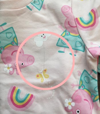 First off, it’s not a sweatshirt. It’s VERY thin. It’s shaped like a sweatshirt, that’s all. I bought it for warmth. Nope! While this shirt is also adorable, the one received has a very evident flaw in the fabric. Is there no quality control? I would return it, but it is a Christmas gift for my 3 y/o Peppa Pig loving granddaughter. She won’t notice the obvious flaw, but I hate paying full price for something that has an issue like this. I definitely considered returning it, but I wouldn’t be able to find and receive one in time for Christmas. The shipping on this one took 10 days.