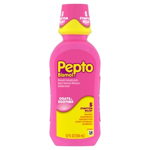 When you need upset stomach relief, Pepto Bismol over-the-counter medicine coats, calms and soothes your stomach, providing fast digestive relief from nausea, heartburn, indigestion, upset stomach, and diarrhea. Pepto Bismol is formulated to coat your digestive tract to calm and soothe and provide fast and effective 5 symptom relief. Take Pepto Bismol at the first sign of digestive issues so you can get rapid relief. Pepto Bismol liquid also provides relief from multiple stomach upsets so you can get back on track fast! From the maker of the #1 Pharmacist Recommended Upset Stomach Brand - Pepto Bismol.