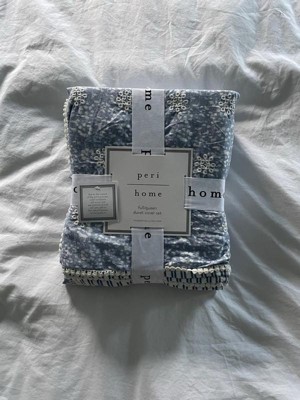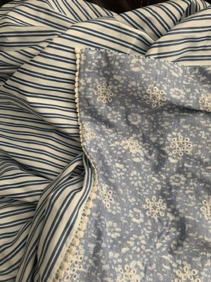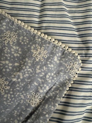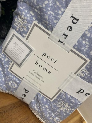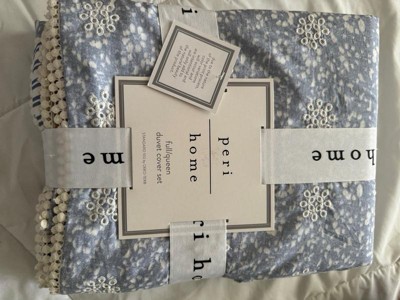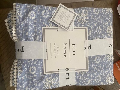 The Peri Home Ikat Eyelet Bedding Collection is a modern take on a vintage favorite. A charming eyelet in sky blue is romanced with a printed floral and reverses to a striped blue and white pattern, lending unexpected contrast. This cozy ensemble gets a whimsical touch from the pom-pom lace edge finish.