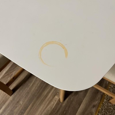 It’s a beautiful table! Perfect size. Good quality. I took one star away because it is NOT stain friendly. The photo I included in this review is a Gatorade stain :( I’ve only tried to wipe it using a disinfectant wipe, so hopefully another method will take it out.