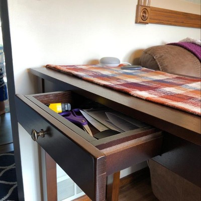 The Perrone High Table with Drop Leaf is a wonderful choice for apartment living or kitchen dining. The unique design of the Solid Wood frame offers the utmost in stability for expanding the table size. The legs slide out to support the drop leaf when open. Slide the apron and legs back when the drop leaf is folded back down. With the leaf extended, the table seats four comfortably with leg space for everyone. Or with leaf folded down, pull up a couple of counter stools and enjoy a casual meal for two. The table can also be used as a console or convenient place to work on your laptop. A center drawer with a satin nickel finish knob keeps pens, pads, and other small items within easy reach. The table frame is constructed of sturdy Solid Wood and the tabletop in wood veneers, all in a gleaming Walnut finish.