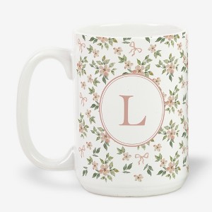 Sip in style every morning with the Personalization Mall Blush & Bloom Pink Bows Coffee Mug. This beautifully crafted 15 oz. ceramic mug combines elegance with a personal touch, making each sip a truly unique experience. Whether it's your initial or that of a loved one, the charming floral design adorned with delicate pink bows is sure to bring a smile. Its beveled bottom rim adds a touch of sophistication to your collection while ensuring stability. Microwave and dishwasher safe, it offers convenience without compromising on style. Treat yourself or delight someone special with this personalized treasure, perfect for transforming any beverage into a delightful ritual.