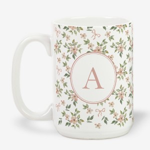 Sip in style every morning with the Personalization Mall Blush & Bloom Pink Bows Coffee Mug. This beautifully crafted 15 oz. ceramic mug combines elegance with a personal touch, making each sip a truly unique experience. Whether it's your initial or that of a loved one, the charming floral design adorned with delicate pink bows is sure to bring a smile. Its beveled bottom rim adds a touch of sophistication to your collection while ensuring stability. Microwave and dishwasher safe, it offers convenience without compromising on style. Treat yourself or delight someone special with this personalized treasure, perfect for transforming any beverage into a delightful ritual.