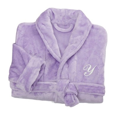 Find luxury in this initial embroidered fleece robe. This short robe makes for a perfect gift for anyone who loves a personalized touch in their self care routine. Your first or last initial will be skillfully embroidered on the left in pink thread and bridal script font. This soft and fluffy robe features a belt tie to adjust the size and two large front pockets.
