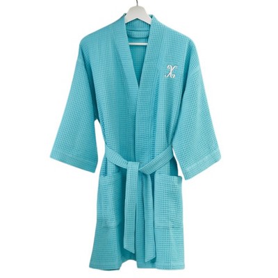 Find luxury in this Embroidered Waffle Weave Robe. This knee length robe makes for a perfect gift for anyone who loves a personalized touch in their self care routine. The lightweight fabric makes this the perfect dressing gown, or robe for the warmer months. Make your home feel like a spa with this mint colored robe, featuring your first or last initial embroidered in white fancy script font.
