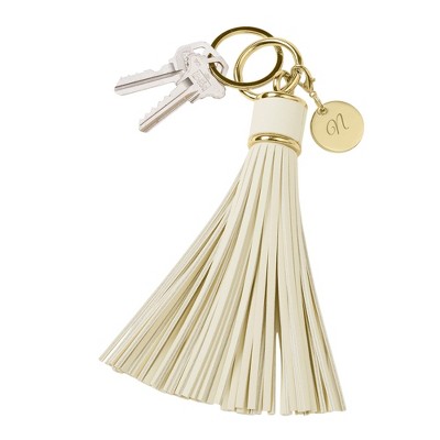 - Black leather tassel keychain & bag tag. Features a removable lobster claw charm with engraved initial.