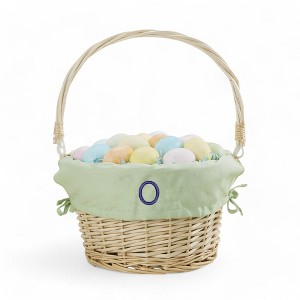 Delight your child this Easter with our Personalized Initial Willow Easter Basket with Folding Handle. This beautiful, hand-woven basket comes in a natural color and measures approximately 17"-19" H x 12" D with the handle. Each basket is unique, with slight variations in color and size, adding to its charm. The basket is not just functional but also adorable and can be cherished for many years. It comes with white metal hinges on each side of the handle for easy storage. Please note that the handle does not stand up on its own. The standout feature of this basket is the removable liner, personalized with any initial of your choice. The liner includes a tie closure and can be spot cleaned for convenience. This personalized Easter basket is perfect for filling with Easter basket stuffers, making it an ideal gift for your little one. Please note that the basket content is not included. Whether it's a baby's first Easter or a fun surprise for an older child, this personalized willow Easter basket is sure to make their day extra special.
