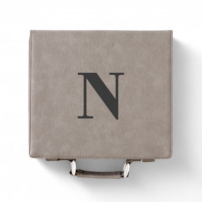 Elevate your poker nights with the sophisticated Personalization Mall Grey Leatherette Poker Chip Set. Tailored for the passionate player, this set ensures a captivating experience whether at home or on the go. Encased in a chic grey leatherette case, it combines style and portability with convenient snap closures and a sturdy handle. Personalize your set with an initial of your choice, transforming game nights into a truly distinctive affair. Inside, you'll find everything needed for a top-notch game: two standard decks of cards, four sets of poker chips, and a set of five dice, all perfectly housed within a sleek storage case measuring 8.875 inches in length and 7.75 inches in width. The use of faux leather and foam materials ensures a durable yet elegant touch. Please note, however, that this set contains small parts and is not suitable for children under 3 years old. With this comprehensive set, every game is an invitation to fun and strategy.