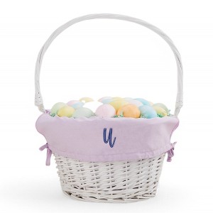 Delight your child this Easter with our Personalized Initial White Easter Basket with Folding Handle. This beautiful, hand-woven basket comes in a white color and measures approximately 17"-19" H x 12" D with the handle. Each basket is unique, with slight variations in color and size, adding to its charm. The basket is not just functional but also adorable and can be cherished for many years. It comes with white metal hinges on each side of the handle for easy storage. Please note that the handle does not stand up on its own. The standout feature of this basket is the removable liner, personalized with any initial of your choice. The liner includes a tie closure and can be spot cleaned for convenience. This personalized Easter basket is perfect for filling with Easter basket stuffers, making it an ideal gift for your little one. Please note that the basket content is not included. Whether it's a baby's first Easter or a fun surprise for an older child, this personalized Easter basket is sure to make their day extra special.