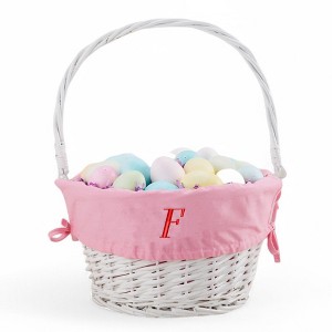 Delight your child this Easter with our Personalized Initial White Easter Basket with Folding Handle. This beautiful, hand-woven basket comes in a white color and measures approximately 17"-19" H x 12" D with the handle. Each basket is unique, with slight variations in color and size, adding to its charm. The basket is not just functional but also adorable and can be cherished for many years. It comes with white metal hinges on each side of the handle for easy storage. Please note that the handle does not stand up on its own. The standout feature of this basket is the removable liner, personalized with any initial of your choice. The liner includes a tie closure and can be spot cleaned for convenience. This personalized Easter basket is perfect for filling with Easter basket stuffers, making it an ideal gift for your little one. Please note that the basket content is not included. Whether it's a baby's first Easter or a fun surprise for an older child, this personalized Easter basket is sure to make their day extra special.