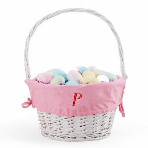Delight your child this Easter with our Personalized Initial White Easter Basket with Folding Handle. This beautiful, hand-woven basket comes in a white color and measures approximately 17"-19" H x 12" D with the handle. Each basket is unique, with slight variations in color and size, adding to its charm. The basket is not just functional but also adorable and can be cherished for many years. It comes with white metal hinges on each side of the handle for easy storage. Please note that the handle does not stand up on its own. The standout feature of this basket is the removable liner, personalized with any initial of your choice. The liner includes a tie closure and can be spot cleaned for convenience. This personalized Easter basket is perfect for filling with Easter basket stuffers, making it an ideal gift for your little one. Please note that the basket content is not included. Whether it's a baby's first Easter or a fun surprise for an older child, this personalized Easter basket is sure to make their day extra special.
