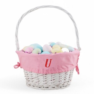 Delight your child this Easter with our Personalized Initial White Easter Basket with Folding Handle. This beautiful, hand-woven basket comes in a white color and measures approximately 17"-19" H x 12" D with the handle. Each basket is unique, with slight variations in color and size, adding to its charm. The basket is not just functional but also adorable and can be cherished for many years. It comes with white metal hinges on each side of the handle for easy storage. Please note that the handle does not stand up on its own. The standout feature of this basket is the removable liner, personalized with any initial of your choice. The liner includes a tie closure and can be spot cleaned for convenience. This personalized Easter basket is perfect for filling with Easter basket stuffers, making it an ideal gift for your little one. Please note that the basket content is not included. Whether it's a baby's first Easter or a fun surprise for an older child, this personalized Easter basket is sure to make their day extra special.