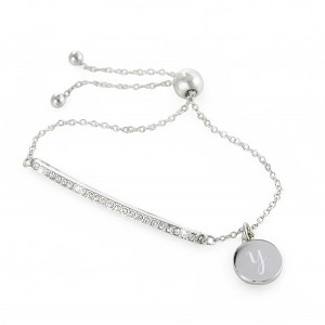 Accent your outfit with the perfect piece of personalized style with our Rhinestone Bar Personalized Initial Bolo Bracelet. With a bar of rhinestones and a personalized initial disc, this bracelet is sure to turn heads!